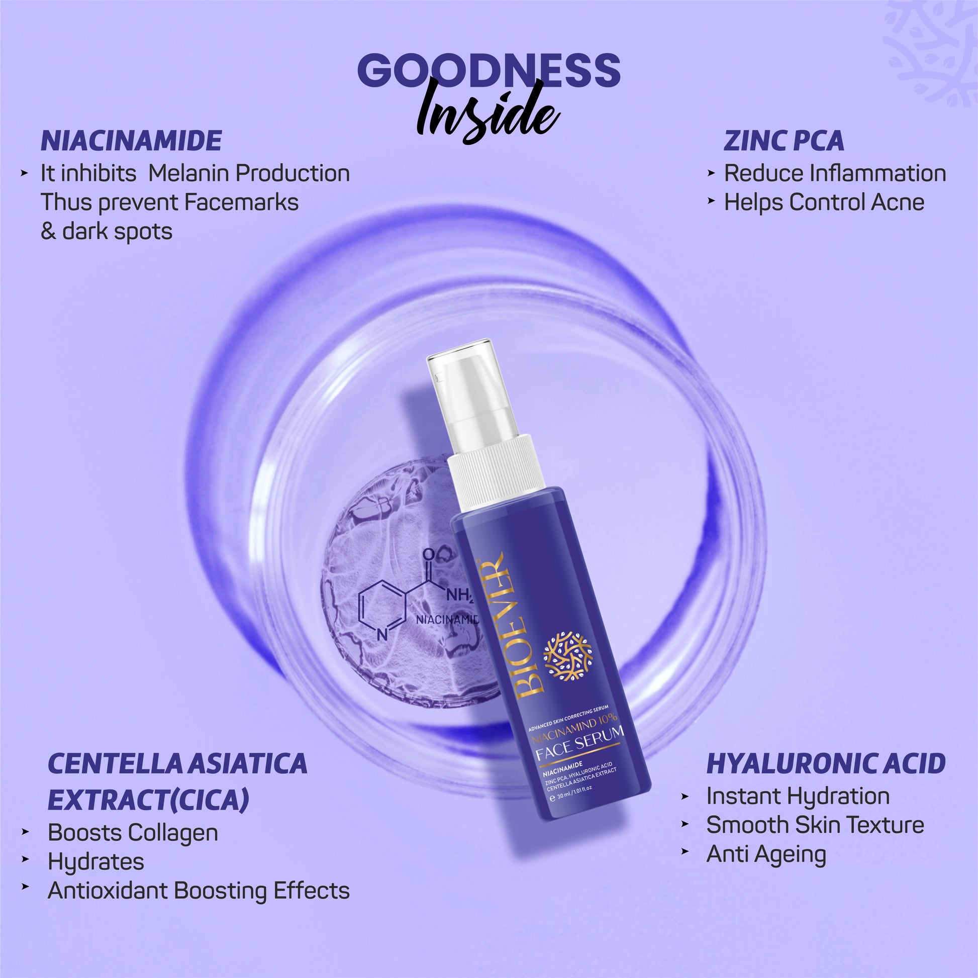 Bioever 10% Niacinamide Face Serum With Cica, Zinc PCA & Hyaluronic Acid for Clear, Blemish Free, Bright Skin. All Skin Types - 50ml